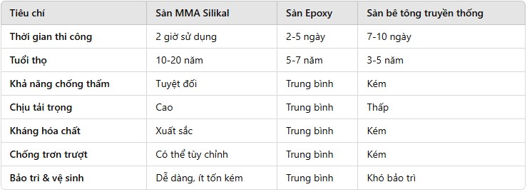 - Bảo dưỡng: Hệ MMA Silikal khô nhanh, có thể đi lại sau 1 – 2 giờ. Tránh tiếp xúc với nước trong 24 giờ đầu để đảm bảo chất lượng.